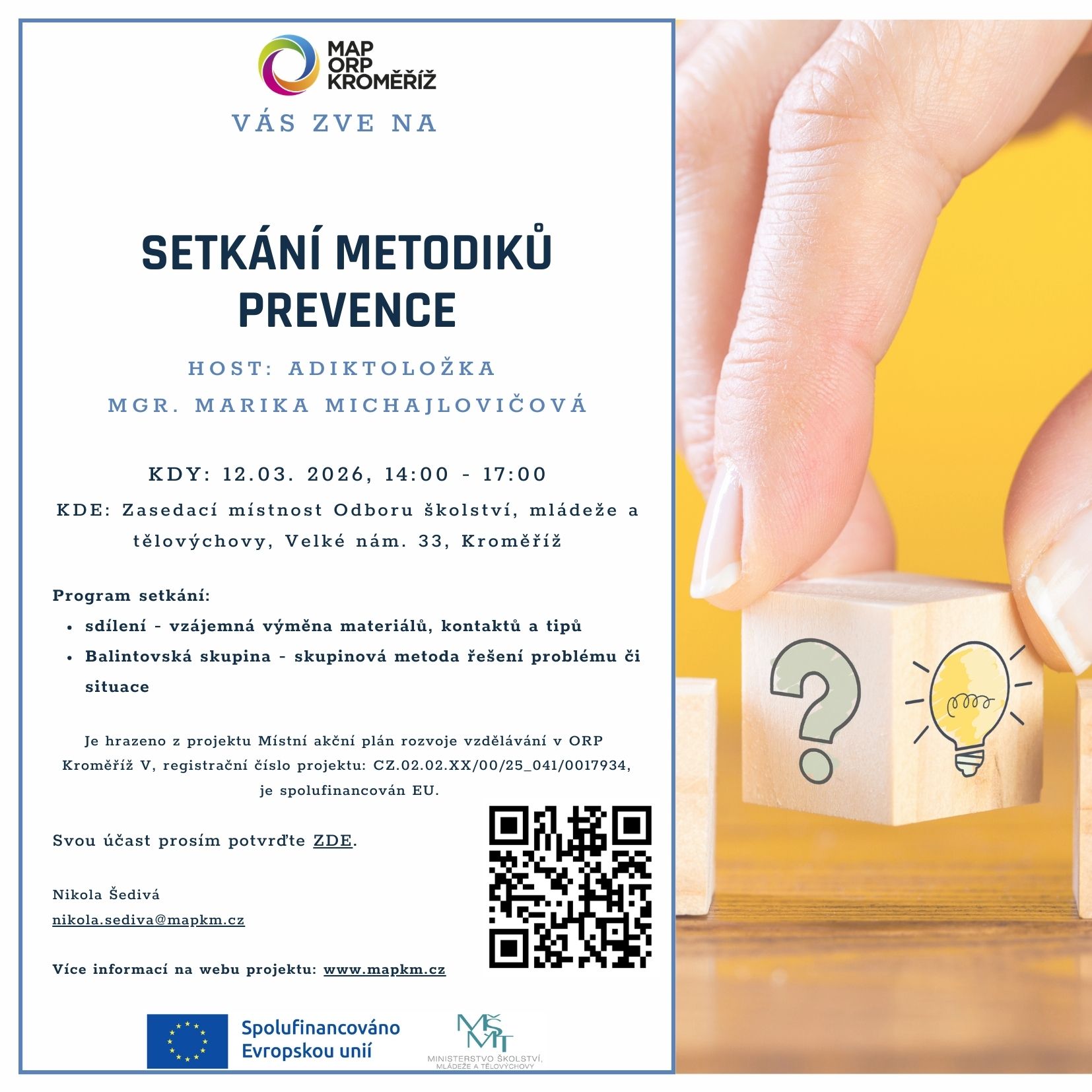 Ve čtvrtek 12. března 2026 nabízíme první prostor v novém projektu MAP V pro tradiční setkání metodiků prevence působící na základních školách v ORP Kroměříž. Hostem bude opět adiktoložka Mgr. Marika Michajlovičová.