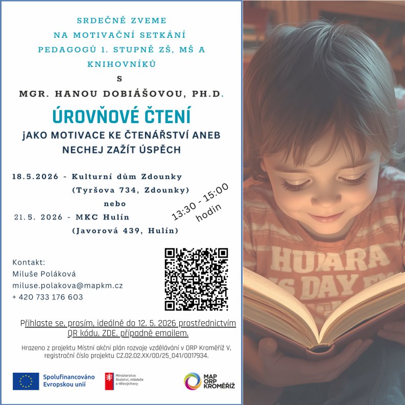 Srdečně Vás zveme (pedagogy 1.stupně ZŠ a MŠ) na motivační setkání ÚROVŇOVÉ ČTENÍ, 18. 5. 2026 ve Zdounkách (Kulturní dům, Tyršova 734) nebo 21. 5. 2026 v Hulíně (MKC Hulín, Javorová 439 _ nové Kulturní centrum směr Holešov), vždy od 13:30 do cca 15:00 hodin.