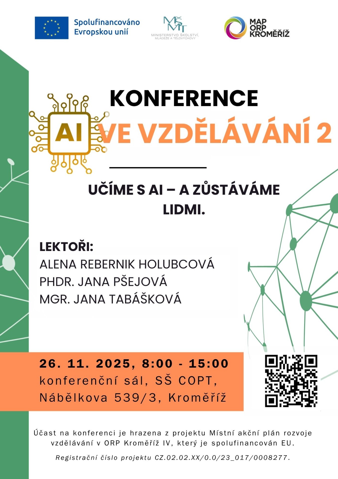 Dne 26.11. 2025 připravujeme v rámci projektu MAP IV ORP Kroměříž druhý ročník konference o umělé inteligenci s názvem AI VE VZDĚLÁVÁNÍ II: Učíme s AI - a zůstáváme lidmi.