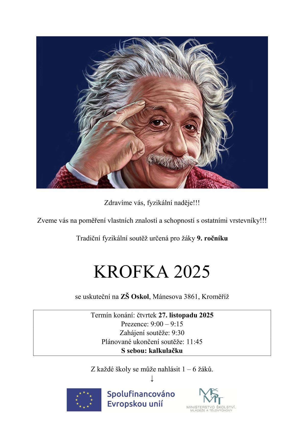 Dne 27. listopadu se uskuteční tradiční soutěž pro 9. třídy KROFKA 2025 ve školním roce 2025/2026. Opět se potkáme v 9:00 hod. na ZŠ Oskol v Kroměříži. S sebou si vezměte kalkulačku.